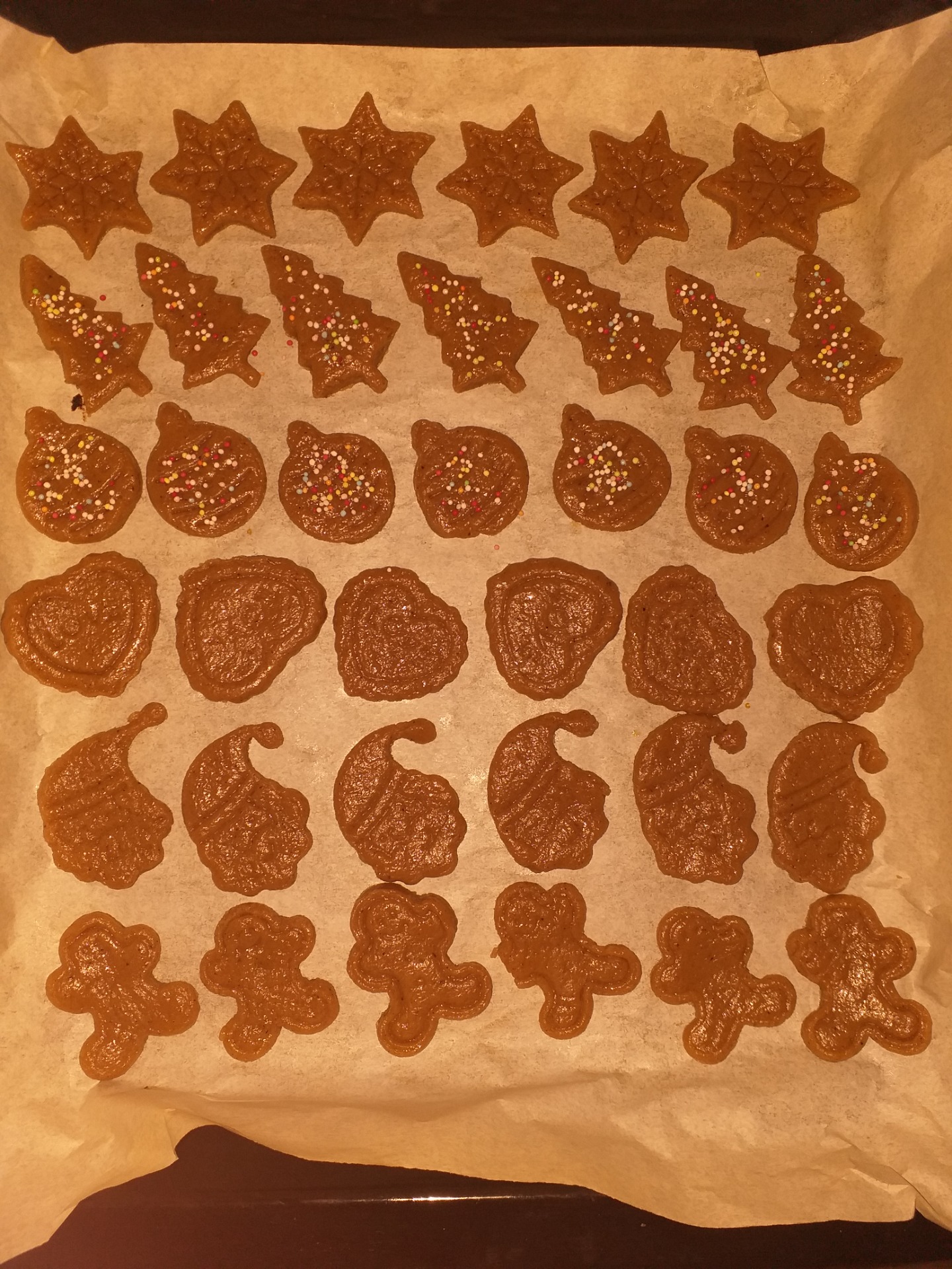 - A mézeskalács tésztáját liszttel alaposan megszórt deszkán kb. 1 cm vastagra kinyújtjuk, majd karácsonyi kiszúrókkal (csillag, angyal, fenyőfa, csengettyű) tetszőleges formákat szaggatunk belőle.